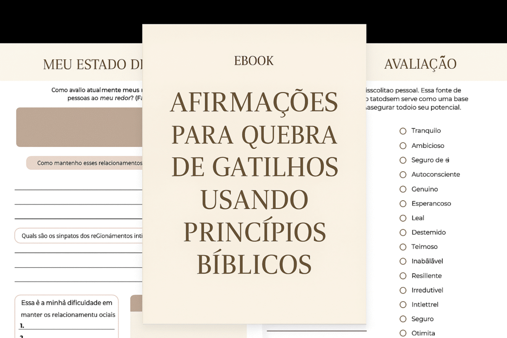 Modelo de reprogramação com declarações bíblicas que fortalecem autoestima, segurança e clareza de propósito, trazendo à memória verdades como: “Sou escolhido”, “Sou amado”, “Sou herdeiro da promessa”.